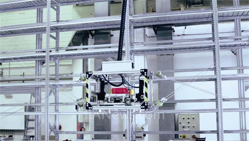 杜伊斯堡 - 埃森大學設計的高架倉庫牽引繩機器人,使用tri-spool傳輸能量和信號。