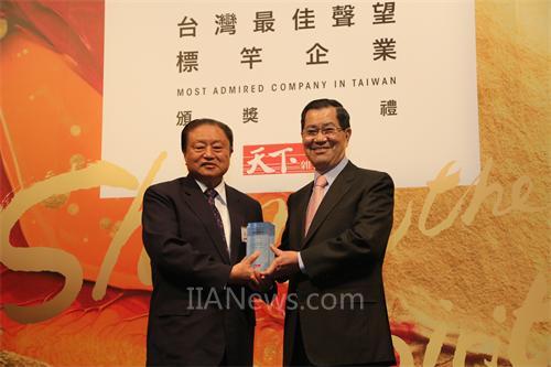 蕭萬長先生(右)頒授獎(jiǎng)座予臺(tái)達(dá)集團(tuán)創(chuàng)辦人暨榮譽(yù)董事長鄭崇華先生(左)