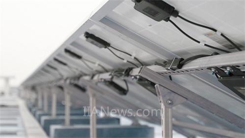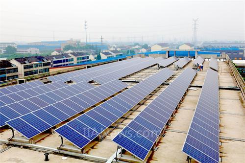 在江蘇省江陰市郊外一塊視野開闊的建筑物屋頂上,整齊地分布著一排排太陽能光伏面板方陣?;液谏拿姘宄?,靈敏地捕捉穿透云層投射來的陽光。