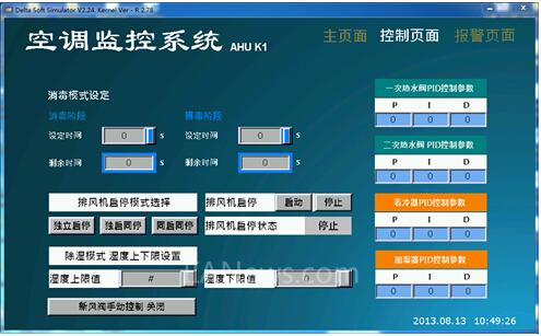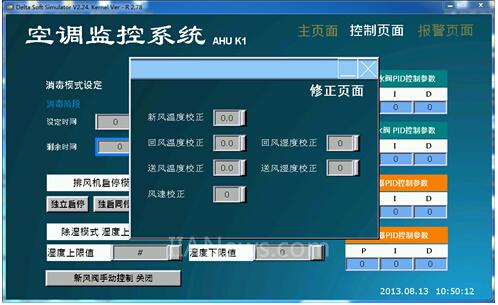 與人機(jī)界面控制功能相似,此畫面為空調(diào)監(jiān)控畫面,可直觀地查看并設(shè)定溫濕度、風(fēng)速、風(fēng)機(jī)頻率,選擇工作模式、季節(jié)模式、排風(fēng)機(jī)啟停模式,啟停風(fēng)機(jī),設(shè)定PID參數(shù)、閥門開度、除濕上下限、消排毒時間…