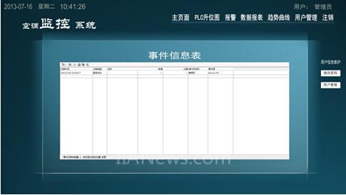 事件記錄畫面中,普通用戶可以進(jìn)行密碼修改的相關(guān)操作,管理員可對用戶進(jìn)行添加、刪除和密碼管理操作;此外,所有成員的登陸、操作信息會被記錄下來,有利于管理者對空調(diào)控系統(tǒng)的管理