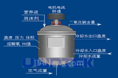通常有發(fā)酵罐溫度、發(fā)酵罐壓力、發(fā)酵液體積、空氣流量、冷卻水進(jìn)出口溫度和流量攪拌馬達(dá)轉(zhuǎn)速、攪拌馬達(dá)電流、泡沫高度等,這些物理參數(shù)根據(jù)不同種類(lèi)的發(fā)酵要求,都可以選擇性的選取有關(guān)測(cè)量?jī)x表來(lái)實(shí)現(xiàn)自動(dòng)測(cè)量。