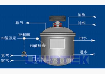 pH是微生物生長(zhǎng)的另一個(gè)重要環(huán)境參數(shù)。在發(fā)酵過(guò)程中,必須嚴(yán)格加以控制,否則會(huì)嚴(yán)重影響微生物代謝的進(jìn)行和代謝產(chǎn)物的合成。在工業(yè)生產(chǎn)上,若發(fā)酵液pH值偏低、氨氮也偏低的時(shí)候,則通過(guò)加氨水等方法使其pH值回升;如果pH值偏高而氨氮偏低,可以補(bǔ)入硫酸銨或氯化銨;若pH值和氨氮都偏高,在發(fā)酵前期,可適當(dāng)增加糖的補(bǔ)加量來(lái)調(diào)整。一般沒(méi)有其它的控制手段。因此在pH值控制中必須嚴(yán)格控制好調(diào)整液的加入量,絕對(duì)不能過(guò)量。如圖2所示,pH值的控制常由pH測(cè)量電極和變送器、pH控制器、空氣開(kāi)關(guān)和氣動(dòng)開(kāi)關(guān)閥組成。