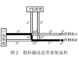 3#散料庫散料皮帶輸送往1#、2#包裝樓皮帶系統(tǒng)流程見圖2。系統(tǒng)有1#、6#挖料機(jī)2臺;2#、3#、4#、5#、7#、8#輸送皮帶6條;9#、10#、11#、12#分料器4臺。工作時(shí),3個(gè)選擇開關(guān)每次只選擇一條路徑,分料器自動(dòng)切換。8種路徑是: