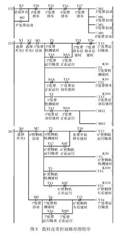 梯形圖編輯軟件是三菱公司提供的GXDeveloperV7?8中文編輯軟件,散料皮帶控制梯形圖程序以圖5為例說明如下: