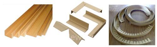 按橫截面形狀,紙護角可分為U型、L型(或V型)等。在紙護角的規(guī)定位置上沖出槽口,便可對紙護角作90度折彎或環(huán)繞。