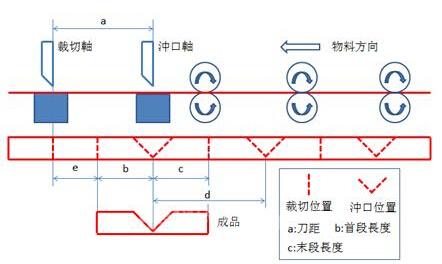 當成品的首段長大于刀距時:裁切的主軸長度始終設為“成品總長”,沖口的主軸長度始終設為“末段長+首段長”。但裁切軸的飛剪電子凸輪先嚙合;當主軸行走了“首段長-刀距”時,再啟動沖口軸的飛剪電子凸輪嚙合。更多段數(shù)產(chǎn)品的裁切、沖口過程以此類推,不作分析。