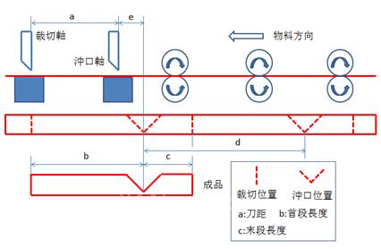 當b>a時,設置好初始飛剪電子凸輪數(shù)據(jù)后,先讓裁切軸飛剪電子凸輪嚙合,然后開啟主軸:裁切軸會首先動作一次,裁出成品的第一個有效左端面。當主軸行走了長度e(即a-b)時,再讓沖口軸的飛剪電子凸輪嚙合,切出成品的第一個有效槽口。后續(xù)主軸每行走長度b+c(即成品總長),裁切軸就裁切一次;主軸每行走長度d(即末段長+首段長),沖口軸就切槽一次。