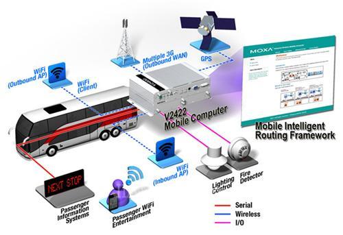 V2422系列無(wú)線計(jì)算機(jī)搭配MIRF(無(wú)線智能路由框架)即可實(shí)現(xiàn)上述功能。MIRF可以將車載無(wú)線計(jì)算機(jī)的配置變得非常簡(jiǎn)單,只需點(diǎn)擊幾次即可完成。在這個(gè)應(yīng)用中,V2422無(wú)線計(jì)算機(jī)作為一個(gè)基礎(chǔ)的系統(tǒng)平臺(tái),然后選配了 EPM-3337和EPM-DK02擴(kuò)展模塊,最終,MIRF配置工具快速將這臺(tái)無(wú)線計(jì)算機(jī)變成了一臺(tái)智能的無(wú)線設(shè)備,具有出色的Wi-Fi通信和蜂窩通訊能力,可為乘客提供基于Wi-Fi和蜂窩網(wǎng)絡(luò)的無(wú)線通訊服務(wù)。 MIRF是完成這一解決方案的關(guān)鍵部分,它可根據(jù)系統(tǒng)集成商的需求添加各種定制服務(wù),無(wú)形中加快了產(chǎn)品推向市場(chǎng)所需的時(shí)間。Moxa MIRF是一個(gè)具有完整協(xié)議棧的軟件框架,它可以: