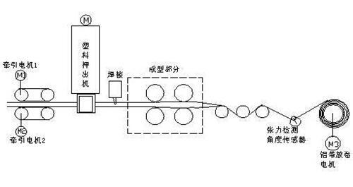 鋁塑管生產(chǎn)線主要是由鋁帶放卷、成型、包膠(押出機(jī))、成型管牽引、收卷(或者切斷)。其中鋁帶放卷和成型管的牽引是采用由丹佛斯FC302變頻器開環(huán)轉(zhuǎn)矩實現(xiàn)的,眾所周知,傳動系統(tǒng)的運動狀態(tài)滿足系統(tǒng)的運動方程式:TM- TL=(GD2/375)*(dn/dt),式中:TM為電機(jī)的電磁轉(zhuǎn)矩,TL 為生產(chǎn)機(jī)械的負(fù)載轉(zhuǎn)矩,包含電機(jī)軸以及與軸連接的機(jī)械系統(tǒng)的轉(zhuǎn)矩,管的張力所形成的反轉(zhuǎn)矩,GD2為轉(zhuǎn)動部分的轉(zhuǎn)動慣量。