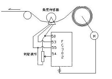 對于鋁帶放卷時候,其張力要求不是很嚴(yán)格,精度也不很高,就由擺錘壓緊鋁帶,其中用一個角度傳感器來檢測其擺錘的角度大小,角度傳感器的輸出信號為0-5VDC。放卷的速度控制由角度控制本身輸出來控制,其變頻器的控制原理圖如下: