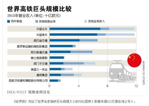 幾年前,中國鐵路業(yè)在技術(shù)上還需要?dú)W洲和日本合作伙伴的幫助。SCI交通咨詢公司負(fù)責(zé)人、鐵路專家瑪利亞·萊嫩稱:“倘若中國人了解到歐洲鐵路業(yè)存在的困難,那么中國南車和北車的合并消息無疑會(huì)使事情更加雪上加霜。中國人為了向全世界提供工業(yè)產(chǎn)品,他們已經(jīng)把觸角伸向了方方面面。這也包括高鐵行業(yè)。”