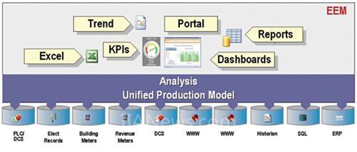 統(tǒng)一生產(chǎn)模型(UPM)是羅克韋爾EEM軟件的核心。UPM模擬了工廠集中能源供應(yīng)中的蒸汽、冷卻水、電力以及每個樓宇在配置時間間隔的需求,結(jié)合了當(dāng)前和預(yù)報的天氣條件、生產(chǎn)安排和以前行為等所有信息。模型是統(tǒng)一的,因為他對復(fù)雜的多個數(shù)據(jù)源進(jìn)行了抽象,并創(chuàng)建了一種一致的、所有可用數(shù)據(jù)都統(tǒng)一的視圖 -- 歷史、當(dāng)前和未來的預(yù)測。