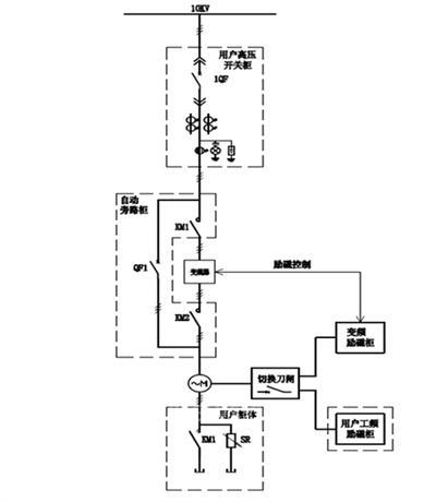 變頻運(yùn)行方式:1QF為用戶側(cè)高壓開關(guān)柜,其中KM1、KM2為交流接觸器、QF1