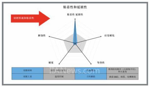 當(dāng)初始加工結(jié)果未達(dá)到預(yù)期時,可以使用這種綜合方法,它能調(diào)整刀具和切削參數(shù),從而獲得所需結(jié)果。例如,如果預(yù)計材料具有高粘著趨向,則會產(chǎn)生長切屑。但是,如果切屑比預(yù)期的偏長或偏短,表示粘著趨向大于或弱于最初的判斷。查看五角星分析圖,或者只需要知道其他屬性的性能影響指標(biāo),便能幫助機(jī)床技工調(diào)整刀具特性和切削參數(shù),以適應(yīng)工件的實際屬性。這就如同調(diào)整蛋糕配方中的成分以解決第一次烘焙操作不如意的情況。