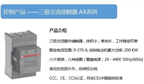 作為今年推出的ABB全新一代交流接觸器,AX系列接觸器具有結構緊湊、工作穩(wěn)定可靠、安裝維護簡單等特點。秉承嶄新的設計理念,AX系列可與ABB的其他元器件完美組合,從而節(jié)省了安裝時間和柜體的安裝空間。目前,該產品被廣泛應用于工業(yè)及民用領域,對電動機、照明設備、電力線路等進行控制及通斷。