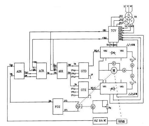 控制電路主要由轉(zhuǎn)速調(diào)節(jié)器ASR、電流調(diào)節(jié)器ACR、環(huán)流調(diào)節(jié)器ARR,正組觸發(fā)器GTD、反組觸發(fā)器GTS、電流反饋器TCV組成(見(jiàn)圖2),其中2組觸發(fā)器的同步信號(hào)分別取自與整流變壓器相對(duì)應(yīng)的同步變壓器。