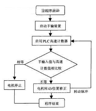 程序設(shè)計(jì)方案為手動(dòng)輸入一個(gè)角度值,讓電機(jī)轉(zhuǎn)動(dòng),通過(guò)與電動(dòng)機(jī)相聯(lián)的光電碼盤(pán)來(lái)檢測(cè)電動(dòng)機(jī)轉(zhuǎn)的角度,將轉(zhuǎn)動(dòng)角度變成脈沖信號(hào)。由于電動(dòng)機(jī)的轉(zhuǎn)速非???,所以只能把脈沖信號(hào)送往PLC的高速計(jì)數(shù)器。然后將計(jì)數(shù)器的脈沖記錄與手輸入的進(jìn)行比較,如果兩者相等說(shuō)明電動(dòng)機(jī)已經(jīng)到達(dá)指定角度位置,否則繼續(xù)進(jìn)行修正。值得注意的是,由于電動(dòng)機(jī)從轉(zhuǎn)動(dòng)突變到停止會(huì)有一定的慣性,因此在進(jìn)行信號(hào)比較時(shí)應(yīng)允許有一定的誤差,不然電動(dòng)機(jī)就會(huì)始終處在修正位置狀態(tài)。系統(tǒng)程序框圖如圖3所示。