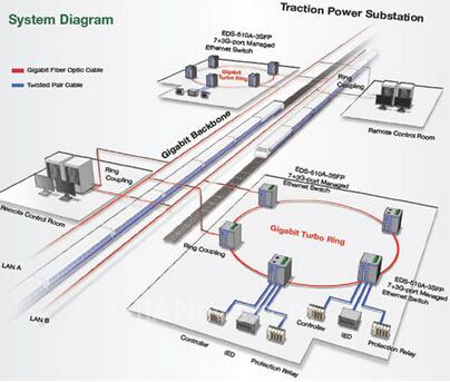 在牽引變電所之間,100臺(tái)EDS-510A-3SFP以太網(wǎng)交換機(jī)構(gòu)成了數(shù)目龐大的冗余通信環(huán)路。根據(jù)地鐵車(chē)站的分布位置,還為每一個(gè)冗余通信環(huán)路分配了不同的虛擬局域網(wǎng),從而可實(shí)現(xiàn)對(duì)每個(gè)車(chē)站段的單獨(dú)管理。為了將子系統(tǒng)集成到主系統(tǒng)中,每個(gè)冗余環(huán)配置了兩臺(tái)EDS-510A以太網(wǎng)交換機(jī),并通過(guò)環(huán)耦合技術(shù)連接千兆骨干網(wǎng)上的不同局域網(wǎng)段。EDS-510A系列交換機(jī)都支自愈技術(shù),恢復(fù)時(shí)間少于20ms,從而為電力監(jiān)控系統(tǒng)提供了隨時(shí)可用的網(wǎng)絡(luò)連接,該功能也大大增強(qiáng)了鐵路網(wǎng)絡(luò)電力系統(tǒng)的可靠性。