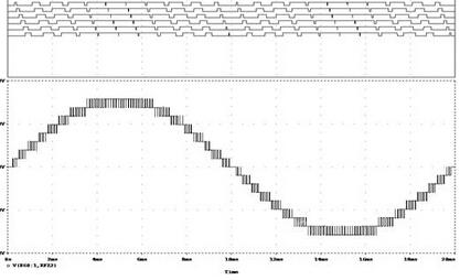 將每相N個功率單元輸出的PWM電壓波形進行疊加,產(chǎn)生出2N+1個電壓階梯的多重化相電壓波形,5個功率單元輸出的PWM波形及疊加之后的相電壓波形如圖所示: