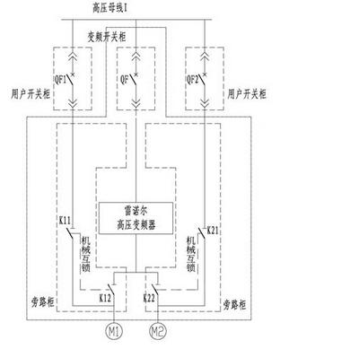 主扇風機為對旋型軸流通風機,一用一備,每臺風機包含兩臺電機,選用一臺變頻器拖動兩臺電機同時運行方式,外部加裝手動一拖二旁路切換柜。主回路如圖所示。