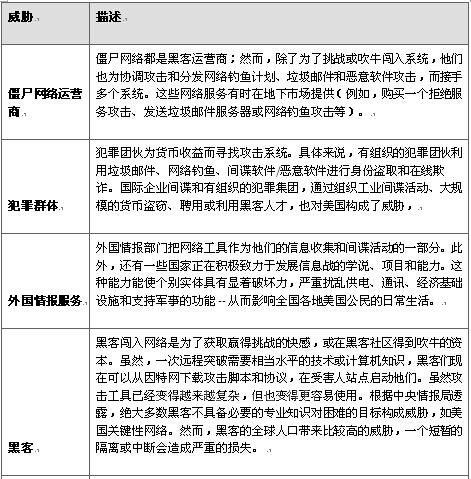 國家網(wǎng)絡(luò)戰(zhàn)計劃是唯一對全范圍目標構(gòu)成的威脅,可能會損害美國的利益。這些威脅范圍從政治宣傳和低層次的騷擾網(wǎng)頁,到造成生命損失和基礎(chǔ)設(shè)施破壞的活動。在一系列網(wǎng)絡(luò)威脅中,我們可以看到:只有政府資助的開發(fā)項目才能可持續(xù),能構(gòu)成廣泛、長期損害美國關(guān)鍵基礎(chǔ)設(shè)施的能力。