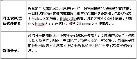這個討論的目的是要對故意威脅進行分類,與2001年6月21日由勞倫斯·格什溫 -- 中央情報局國家科技情報總監(jiān) -- 在聯(lián)合經(jīng)濟委員會記錄聲明的言論相一致。對象可能包括:各國政府、恐怖分子、工業(yè)間諜、有組織的犯罪團伙、黑客活動家和黑客。行動可能包括:間諜活動、黑客入侵、身份盜竊、犯罪和恐怖主義。