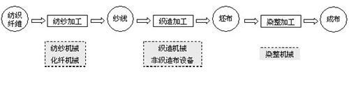 紡織生產是從紡織原料加工到生產出高質量紡織產品的復雜過程,應用的紡織機械達2千多個品種、5萬多種型號,歸納起來大體可分為三個主要加工過程和五大類紡織機械。以下以圖示表示紡織機械的分類: