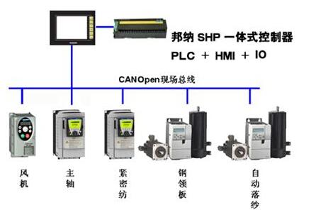 在緊密紡細紗機的控制系統(tǒng),采用了三套伺服驅動系統(tǒng)和無刷伺服電機,分別控制前、后羅拉以及鋼領板;采用1臺變頻器控制主傳動電機,采用1臺變頻器控制風機;整個系統(tǒng)采用邦納SHP一體式控制器進行控制和監(jiān)控,SHP一體式控制器與變頻器及伺服間采用高速CANopen總線進行通訊,同時采用SHP集成的觸摸屏進行系統(tǒng)操作和監(jiān)控。