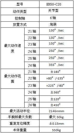 本次項目所使用的50kG六關(guān)節(jié)工業(yè)機器人是國產(chǎn)最新型號,具有結(jié)構(gòu)緊湊,關(guān)節(jié)速度較高,動態(tài)響應(yīng)快,精度高,過載能力強等特點。電控系統(tǒng)采用總線結(jié)構(gòu),擴展應(yīng)用方便。適用于搬運,激光切割,打磨拋光等場合。其產(chǎn)品性能如下表所示: