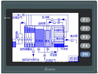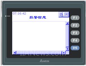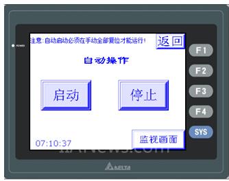 進入選擇畫面,有自動畫面、手動畫面、報警畫面、監(jiān)視畫面,時間設(shè)定和功能選擇六個按鈕,點擊相應(yīng)的按鈕可進入相應(yīng)畫面。