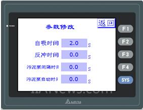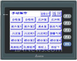 手動畫面可以實現(xiàn)機器的手動操作;為安全考慮,機器動作有諸多保護,在允許的正確的狀態(tài)下按各按鈕才有效。如自吸泵必須在自吸閥打開的前提下才能打開,關(guān)閉自吸閥前必須先關(guān)自吸泵。反沖泵、反沖閥和污泥泵、污泥閥也是一樣。其他可單獨啟動。另還有一個“查看運行”按鈕,點擊也可進入整機監(jiān)控畫面對機器運行進行實時監(jiān)控。