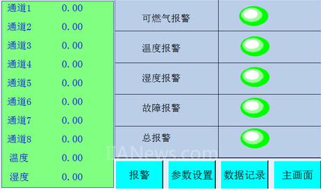 1、監(jiān)控畫面:此畫面將讀上來的數(shù)據(jù)經(jīng)過運(yùn)算處理,將當(dāng)前通道的氣體濃度,溫度,濕度顯示在屏幕上。監(jiān)視報(bào)警信號(hào),提醒工作人員。