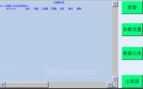 4、報(bào)警記錄:此畫面記錄報(bào)警的信息,并把記錄的信息存儲(chǔ)在U盤里,可調(diào)出來查閱。
