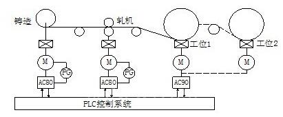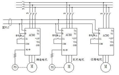 電池鋅板生產(chǎn)線中,從鑄造機(jī)中出來(lái)熱鋅板,軋制后,再進(jìn)行收卷,其中收卷工位為2個(gè), 以保證連續(xù)生產(chǎn)。通常情況下,軋機(jī)主速度是跟隨鑄造速度信號(hào)而變化,且可以同時(shí)進(jìn)行比例微調(diào),收卷為1臺(tái)矢量變頻器控制2臺(tái)不同工位但電機(jī)參數(shù)一致的異步變頻電機(jī)(卷徑變化大必須采用變頻專(zhuān)用電機(jī))。如圖1所示,包括鑄造機(jī)變頻器AC80、軋機(jī)變頻器AC80、中心收卷變頻器AC90、可編程控制器PLC系統(tǒng)組成。AC90變頻器涉及到2臺(tái)異步電機(jī)切換(兩臺(tái)電機(jī)的特性盡可能的一致),AC90采用開(kāi)環(huán)力矩收卷的模式。該系統(tǒng)中,PLC工藝需要來(lái)輸出都是由所有速度給定,并同時(shí)從各個(gè)變頻器中讀取速度、電流、轉(zhuǎn)矩等信號(hào),以做控制或顯示用。PLC程序主要任務(wù)是:處理起停連鎖、故障報(bào)警、速度控制以及顯示等。