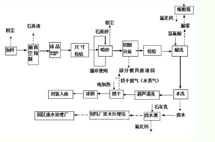 如圖1所示:項(xiàng)目生產(chǎn)產(chǎn)品為石英圓坩堝,主要工藝步驟為模具加料、坩堝熔制爐熔制、成品出爐、尺寸檢驗(yàn)、酸洗、水洗、超聲清洗、涂鋇、包裝入庫。具體介紹如下: