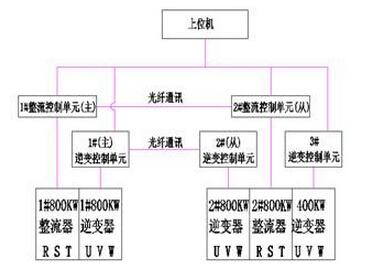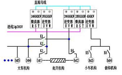 進線電源經(jīng)過兩臺CHA100系列800KW的PWM整流器為四個機構的逆變器提供直流母線電源,1#與2#PWM整流器采用主從控制,PWM整流器之間通過光纖通訊,四個機構的逆變器均掛在直流母線上,可以實現(xiàn)機構與機構之間的能量循環(huán),也可以將機構的能量回饋至電網(wǎng)。
