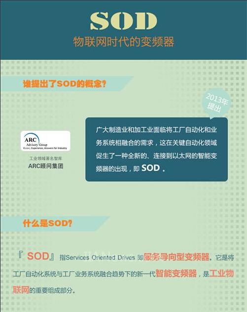 工業(yè)領(lǐng)域著名智庫ARC顧問集團(tuán)曾在其報(bào)告中指出:“廣大制造業(yè)和加工業(yè)面臨將工廠自動化和業(yè)務(wù)系統(tǒng)相融合的需求,這在關(guān)鍵自動化領(lǐng)域促生了一種全新的、連接到以太網(wǎng)的智能變頻器的出現(xiàn),即SOD”。SOD全稱Services Oriented Drives,即服務(wù)導(dǎo)向型變頻器,它是將工廠自動化系統(tǒng)與工廠業(yè)務(wù)系統(tǒng)融合趨勢下的新一代智能變頻器,是工業(yè)物聯(lián)網(wǎng)的重要組成部分。