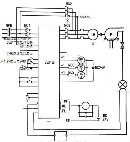 同時(shí)該變頻器內(nèi)置了復(fù)雜的順序控制功能實(shí)現(xiàn)工頻電源和變頻器之間的柔性切換(進(jìn)行切換時(shí)實(shí)現(xiàn)電磁接觸器的互鎖),當(dāng)變頻器運(yùn)行頻率達(dá)到上限及持續(xù)運(yùn)行時(shí)間滿足后(這里分別設(shè)置為50Hz和60s),變頻器自行將變頻無極切換到工頻(不需重新啟動(dòng)),實(shí)現(xiàn)了變頻到工頻的無極切換,大大減少了工頻啟動(dòng)時(shí)對(duì)電網(wǎng)電流及管網(wǎng)水壓沖擊,大大加強(qiáng)了系統(tǒng)的穩(wěn)定性及安全性。電磁接觸器MC2在工頻運(yùn)行時(shí)閉合,變頻運(yùn)行時(shí)斷開;MC3變頻運(yùn)行時(shí)閉合,工頻運(yùn)行時(shí)斷開??刂齐娐啡鐖D3所示。