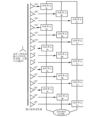 目前,因?yàn)楣β势骷蛪旱南拗疲邏鹤冾l器沒有像低壓變頻器一樣,有統(tǒng)一的拓?fù)浣Y(jié)構(gòu)。目前,市場上主流的高壓變頻器多采用單元串聯(lián)多電平的拓?fù)浣Y(jié)構(gòu),系統(tǒng)結(jié)構(gòu)如圖2所示: