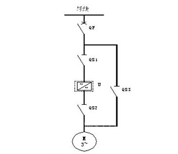 通過咨詢和現(xiàn)場分析,決定采用一拖一手動(dòng)旁路方案:主回路由負(fù)荷開關(guān)QF、3個(gè)高壓隔離開關(guān)QS1、QS2和QS3及高壓變頻器組成(如圖3)。其中要求QS2和QS3不能同時(shí)閉合,在機(jī)械上實(shí)現(xiàn)互鎖。高壓隔離開關(guān)QS1、QS2、SQ3加裝電磁鎖,電磁鎖的操作電源使用QF的輔助觸點(diǎn)閉鎖。只有當(dāng)QF斷開時(shí),QS1、QS2、SQ3的電磁鎖才能得電,可以正常操作。在變頻運(yùn)行時(shí),QS1和QS2閉合,QS3斷開,變頻器得電啟動(dòng)后,電機(jī)處于變頻運(yùn)行狀態(tài);工頻運(yùn)行時(shí),QS3閉合,QS1和QS2斷開,QF閉合后,電機(jī)實(shí)現(xiàn)工頻直接啟動(dòng),恢復(fù)改造前的運(yùn)行狀態(tài)。