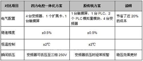 假捻機(jī)的電控系統(tǒng)一般需要1臺(tái)觸摸屏、1個(gè)PLC、2個(gè)PLC模擬量模塊、4臺(tái)變頻器(功率分別為11、7.5、1.5、1.5KW)四個(gè)部分。隨著假捻機(jī)成本價(jià)格的上升以及整機(jī)售價(jià)的降低,使其利潤(rùn)空間逐步減小。四方電氣根據(jù)假捻機(jī)的市場(chǎng)狀況推出了假捻機(jī)電控一體化系統(tǒng),迎合市場(chǎng)的需求。