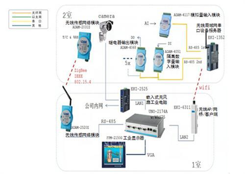 UNO-2174與12寸的FPM-2120,搭載WEBACCESS專業(yè)版充當(dāng)上位監(jiān)控,報警及視頻監(jiān)控的中控系統(tǒng)。EKI-2525充當(dāng)現(xiàn)場所以以太網(wǎng)設(shè)備的有線連接,EKI-6311與EKI-1352完成對所有基于RS485的ADAM4000模塊的采集和控制(其中包含了閥門,報警,CO2濃度,光照度等傳感信號的采集),而ADAM2000系統(tǒng)模塊完成溫濕度的采集。