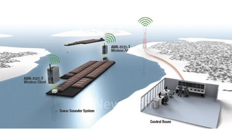 探測聲波的回聲儀實際安裝在駁船的船體下方,用數(shù)米長的線纜與船頭的回聲箱連接。由于駁船的橋位于船尾,橋位和回聲箱之間有一個長度近200英尺的貨物甲板。為了了將回升箱與橋位相連,又不希望采用有線線纜帶來諸多不便,因此在前甲板安裝一臺AWK-31221-T無線客戶端與回聲箱連接,另一臺AWK-3121無線AP則安裝在橋位用于接受來自回聲探測儀的數(shù)據(jù)。