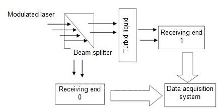 系統(tǒng)結(jié)構(gòu)框圖如圖1所示,經(jīng)調(diào)制后的激光通過分光器后,分得兩束光,其中一束經(jīng)過待測濁液后進(jìn)入接收端1,另一束光直接進(jìn)入接收端0,分別經(jīng)過接收端的信號處理后,形成兩路輸入信號,進(jìn)入數(shù)據(jù)采集系統(tǒng),構(gòu)成雙通道的液體濁度測量裝置。