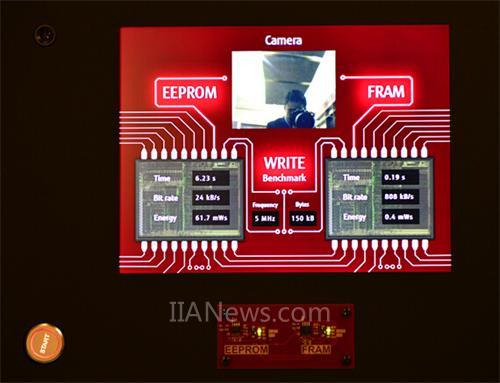 演示本身并不復(fù)雜,一個(gè)照相機(jī)實(shí)時(shí)拍一張照片,然后將照片分別存儲(chǔ)到EEPROM和FRAM中,直觀的比較圖像數(shù)據(jù)寫入過程中EEPROM和FRAM的性能差異。在此演示中,采用并口傳輸數(shù)據(jù),F(xiàn)RAM大概用了0.19秒存儲(chǔ)數(shù)據(jù),而EEPROM大概用了6.23秒;FRAM存儲(chǔ)數(shù)據(jù)的比特率約為808kB/s,而EEPROM存儲(chǔ)數(shù)據(jù)的比特率約為24kB/s;功耗方面,F(xiàn)RAM約為0.4mWs,而EEPROM約為61.7mWs。FRAM的快速讀寫和超低功耗特性顯而易見。