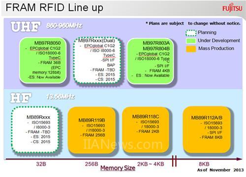 富士通半導(dǎo)體內(nèi)嵌FRAM的RFID產(chǎn)品相比其單體FRAM產(chǎn)品是比較新的,而市場(chǎng)上常用的RFID產(chǎn)品嵌入的是EEPROM。與內(nèi)嵌EEPROM的RFID產(chǎn)品相比,內(nèi)嵌FRAM的RFID讀寫速度快很多,并且其抗輻射性比EEPROM高出不止一個(gè)數(shù)量級(jí)。如下圖5所示為FRAM RFID產(chǎn)品線。