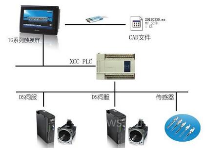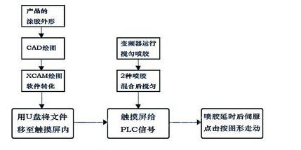 全自動點膠機由3臺變頻器分別控制2種原料各自的攪拌和最后2種原料混合后的攪勻;工作過程是由XCC型PLC控制2臺伺服電機,實現(xiàn)兩軸聯(lián)動,行走路線由繪制的CAD圖形決定,圖形文件經(jīng)轉(zhuǎn)化下載至觸摸屏后,得到PLC能夠自動識別的加工代碼。