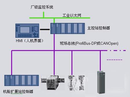 采用LAN/FieldBus系統(tǒng)結(jié)構(gòu),主控站控制器對(duì)外提供百兆以太網(wǎng)接口,利用現(xiàn)場(chǎng)總線完成機(jī)艙擴(kuò)展站控制器或其它現(xiàn)場(chǎng)智能設(shè)備(變頻器等)的連接。主控站以太網(wǎng)接口支持標(biāo)準(zhǔn)的MODBUS TCP/IP規(guī)約,并支持UDP協(xié)議。