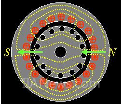 導(dǎo)體感生電流在磁場(chǎng)中受到電磁力的作用而形成驅(qū)動(dòng)轉(zhuǎn)矩,使電機(jī)旋轉(zhuǎn)。